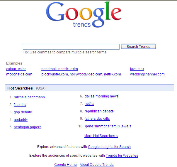 ด้านล่าง มีหัวข้อ Hot Search นั่นก็คือ หัวข้อที่เป็น talk of the town อยู่ในขณะนี้ อ้างจากว่า มันได้ถูกใช้ในการค้นหา 'บ่อย'นั่นเอง    ส่วนเจ้าตัวนี้ วิธีการใช้งานนั้นก็แสนจะง่ายดาย โดยที่เราใส่ Keyword ลงไป  หากต้องการเปรียบเทียบ ก็ใส่ไปหลายๆตัว เช่น ต้องการเปรียบเทียบระหว่าง จิ้งจก ตุ๊กแก ม้าน้ำ ปลิงทะเล ก็เพียงแค่พิมพ์ จิ้งจก,ม้าน้ำ,ตุ๊กแก,ปลิงทะเล  ลงในช่อง แล้วก็กด Search Trends (เราจะสามารถเปรียบเทียบได้ไม่เกิน 5 อัน) เมื่อพิมพ์ไปแล้ว ก็จะขึ้นหน้าตาแบบนี้
