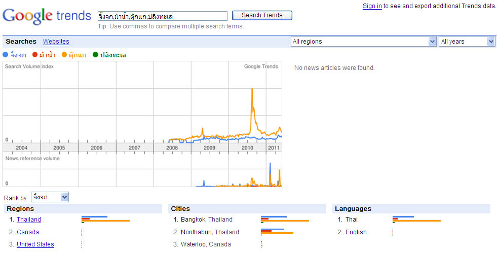 ซึ่งก็จะแสดงข้อมูลต่างๆ ไม่ว่าจะเป็นกราฟการค้นหา  จากรูปจะเห็นได้ว่า ตุ๊กแก(แทนด้วยสีเหลือง) ถูกค้นหามากเป็นอันดับ 1 รองลงมาคือ จิ้งจก(สีน้ำเงิน) ม้าน้ำ(สีแดง) และปลิงทะเล (สีเขียว)  ถัดมา คือ ทางด้านขวามือ ปรกติ หากใช้ keyword ภาษาอังกฤษค้น จะสามารถปรากฎหัวข้อข่าวสำคัญๆที่เกี่ยวข้อง ยังผลให้อันดับของสิ่งที่เราเปรียบเทียบพุ่งสูงขึ้น  ส่วนด้านล่างที่ถัดจากกราฟลงมาเป็นประเทศ เมือง และภาษาใดบ้าง ที่สนใจ keyword ที่เราหาอยู่  แน่นอนว่ามีแต่ประเทศไทย(ก็ใช้ภาษาไทยหานี่นา ^ ^')